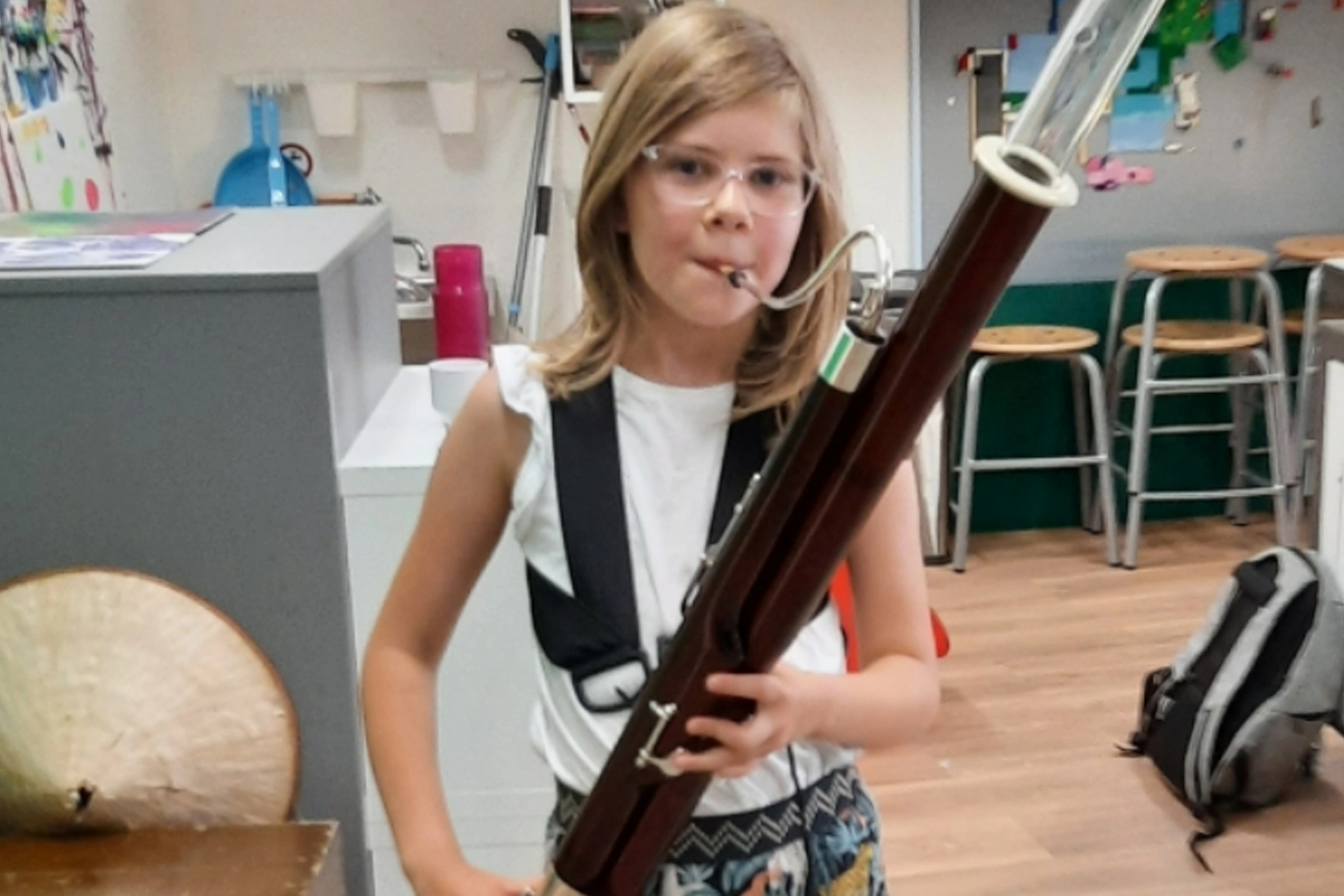 De buis van de fagot is dubbelgevouwen want hij is wel 2.60 meter lang. Door die lengte kan de fagot heel lage tonen produceren. Je houdt het instrument opzij, naast de knie, om het te bespelen. Net als de hobo is de fagot een dubbelrietinstrument. Het riet steekt niet meteen in het instrument, maar zit in een metalen buisje dat op de fagot wordt geplaatst. Door de warme, lage klank van de fagot kun je veel verschillende muziekgenres spelen: van basso continuo in de oude muziek, naar klassiek over pop tot jazz. Met een fagot kun je terecht in een harmonieorkest, een symfonisch orkest en een blaaskwintet.