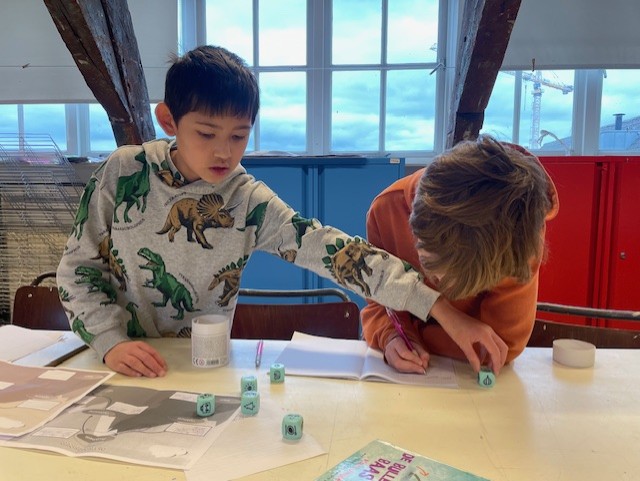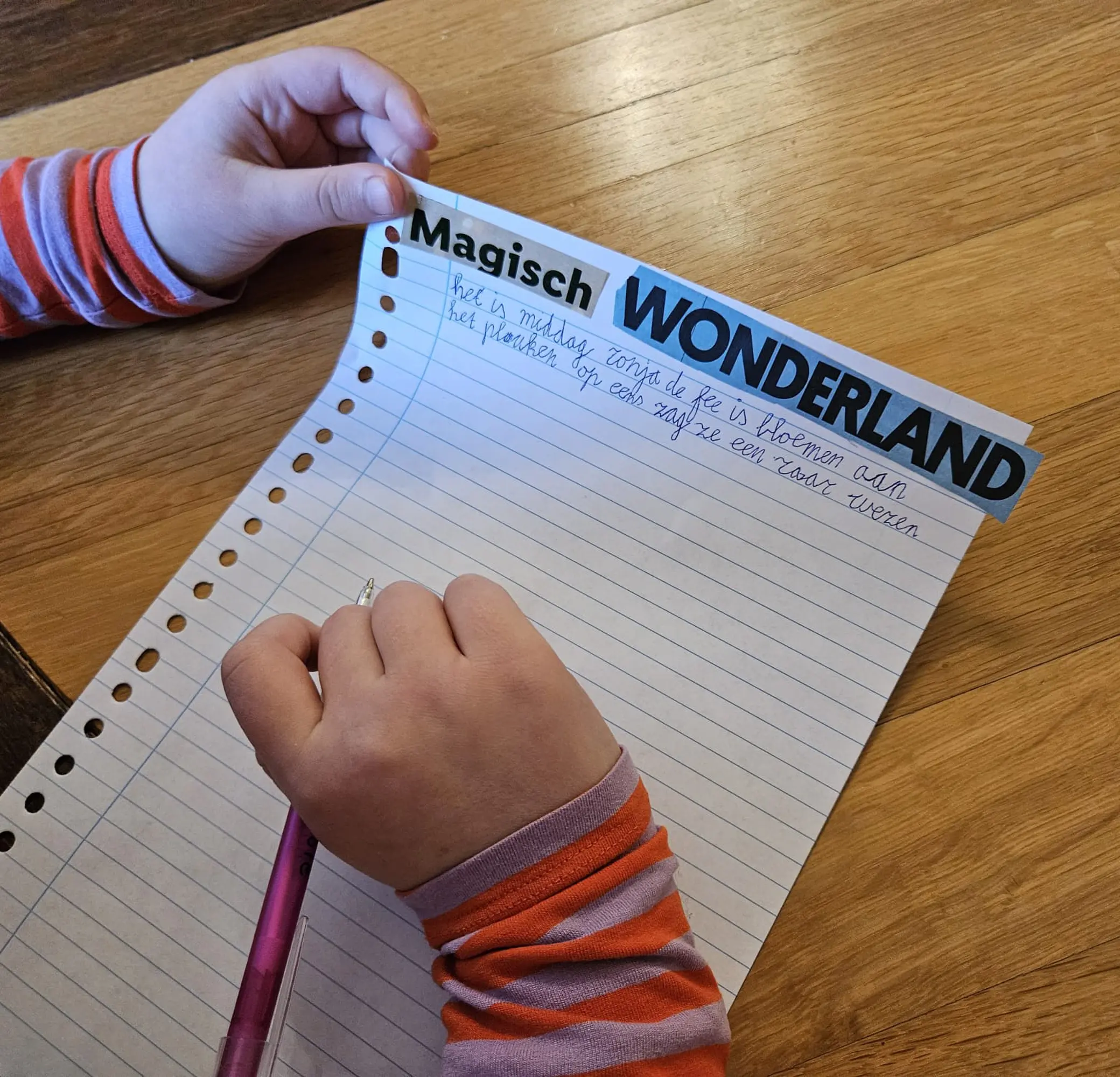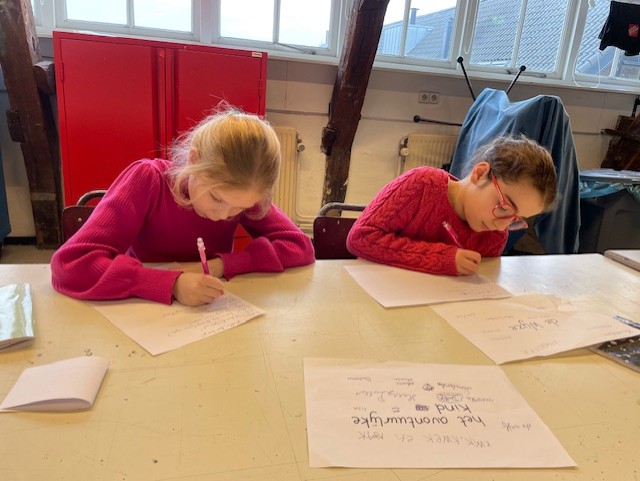 We gaan veel spelen met taal en je leert schrijven te combineren met knippen, plakken en tekenen. We zijn elke les op een hele creatieve manier bezig met schrijven. Het kan zijn dat je aan het einde van de les zere handen van het schrijven hebt en een grote glimlach omdat creatief bezig zijn zo leuk is! De docent zal je vooral aanmoedigen en gaat geen teksten nakijken op spelling en grammatica. We helpen elkaar en soms geven we elkaar tips om de verhalen nog beter te maken. Ook gaan we samenwerken om gedichten en verhalen te maken.