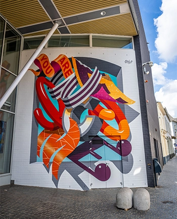In deze schildering lees je ‘You Are Welcome’, een duidelijke statement dat aansluit op de kernwaarden van Nieuwe Veste: iedereen is welkom. Het woord ‘welcome’ verdient de belangrijkste plek in het ontwerp. Iedere letter heeft een ander uiterlijk, kleur en gevoel. In zijn geheel staat dit voor diversiteit en geeft dit elke letter een uniek karakter, net als de bezoekers van Nieuwe Veste.