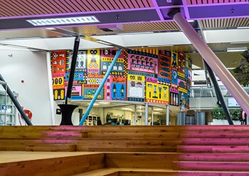 Quote van de kunstenaar over deze muur: “Een streepjescode is gecodeerde informatie, een bibliotheek: een huis vol gecodeerde informatie.”