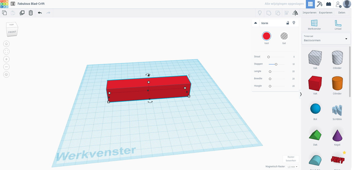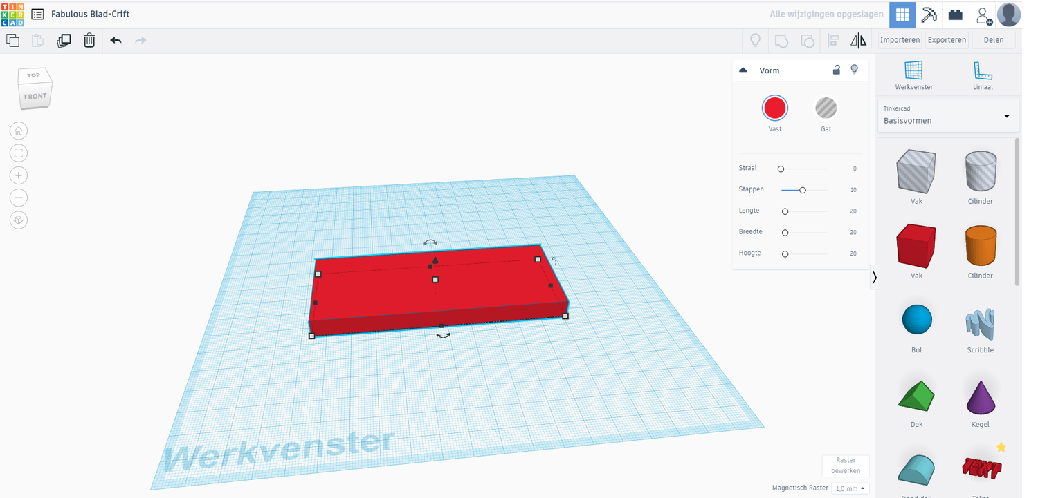 Aan de rechterkant zie je een menu met allerlei verschillende vormen. We beginnen met de rode kubus en slepen deze in het veld.