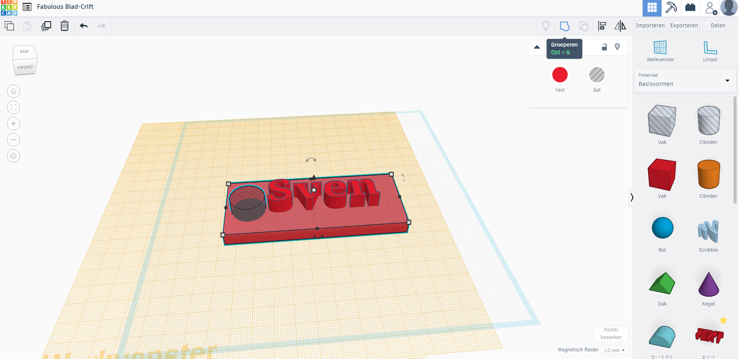 Als laatste gaan we het gat echt maken. Dan doen we door de toets Shift ingedrukt te houden. Daarna klikken we de cilinder en de rechthoek. Wanneer deze beide zijn geselecteerd kunnen we de toetsencombinatie CTRL+G gebruiken of rechtsboven het knopje groeperen aan te klikken.