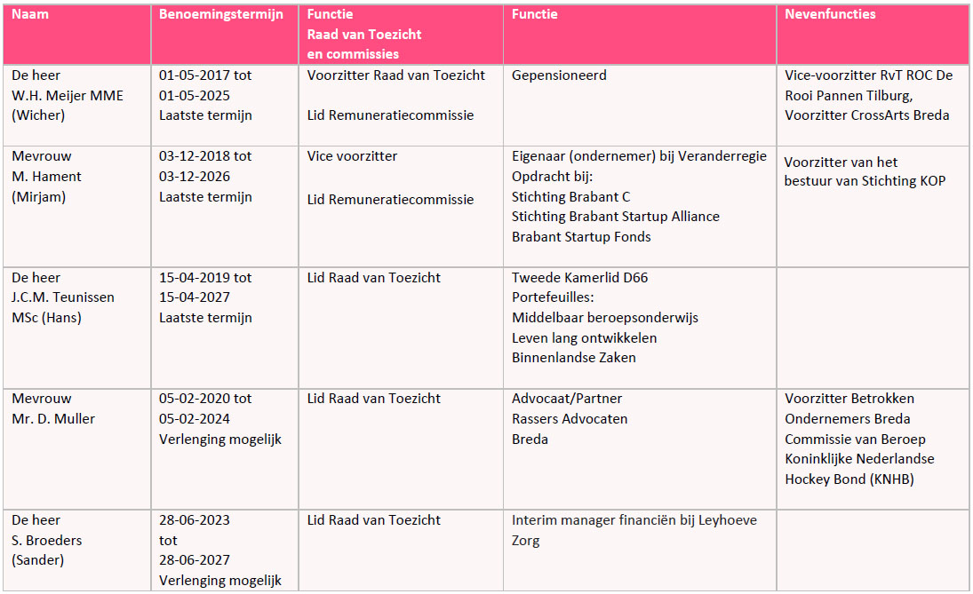 De Raad van Toezicht bestaat in principe uit vijf leden, waaronder de voorzitter. De leden van de Raad van Toezicht zijn geen lid van een directie, bestuur of toezichthoudend orgaan van een instelling binnen de regio Breda die eenzelfde of een gelijksoortig doel heeft als de stichting. De leden worden benoemd voor een termijn van vier jaar en zijn herbenoembaar voor een tweede termijn van vier jaar. De samenstelling van de Raad van Toezicht ontleent haar kracht uit een combinatie van ervaring, deskundigheid en onafhankelijkheid van de leden. Daardoor is de Raad van Toezicht in staat haar taken adequaat te verrichten, in het belang van de Stichting. Dit betekent dat de Raad van Toezicht op zo’n manier is samengesteld dat: